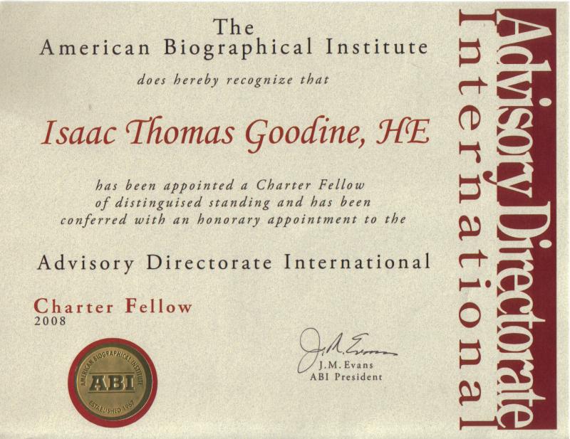 The Advisory Directorate International is a global biographical research board comprised of influential and accomplished individuals. Men and women who devote their time and expertise to serve as advisors to the American Biographical Institute (ABI), a 41-year-old biographical reference publisher. The ABI chose Mr. Goodine for this post by honorary selection. He will recommend individuals for directory recognition based on successes deemed admirable and influential to their peers. An individual's inclusion within a title is not necessairly based on quantity or status of achievement, but rather the discernable effort and involvement in making valuable contributions to progress. Mr. Goodine appreciates this philosophy and will assist the ABI in the significent task of recognizing these individuals.